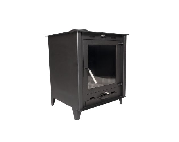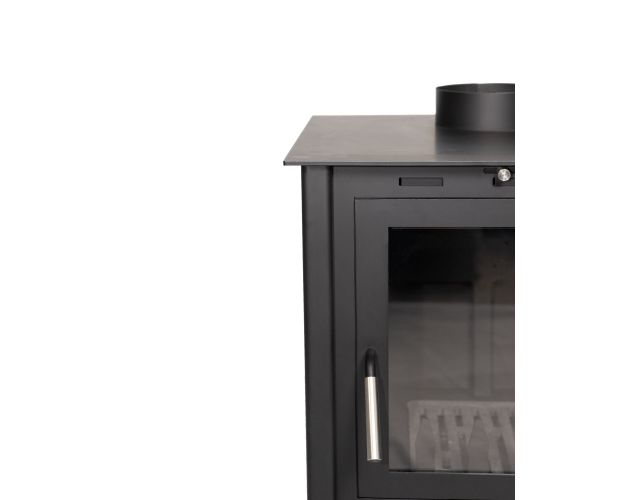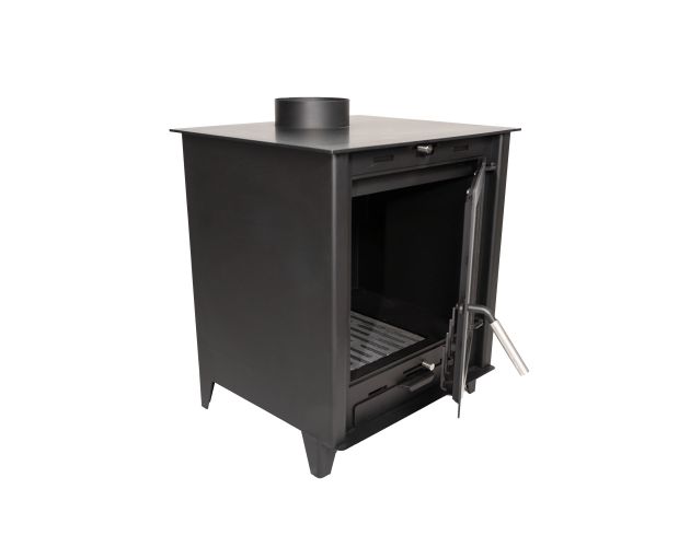 O fogão Ralph é feito de chapa metálica de 3 mm, o que lhe confere resistência e durabilidade. Inclui uma gaveta para cinzas, um gancho para atiçador, uma grande grelha de ferro fundido e puxadores e maçanetas de aço inoxidável, oferecendo grande funcionalidade e facilidade de uso.